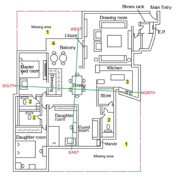1. Missing Key Zones – The apartment had an irregular shape with the Northeast (NE) and Southwest (SW) zones missing. The NE zone is crucial for health and well-being, and its absence can lead to persistent health issues. The missing SW zone impacted stability in life.